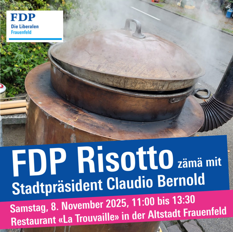 Die FDP-Ortspartei Frauenfeld lädt Sie herzlich zum Gedankenaustausch mit Risottoessen vor und ins Restaurant "La Trouvaille" in der Altstadt Frauenfeld ein. Wir werden bekocht von Nena Jazo, unserer bewährten und begnadeten Risotto Köchin. Mit von der Partie ist Stadtpräsident Claudio Bernold, die Gemeinderätin und die Gemeinderäte. Nutzen Sie die Chance, Ihr Anliegen direkt an den Mann und die Frau zu richten. Wir freuen uns, Sie in der Altstadt zu begrüssen.